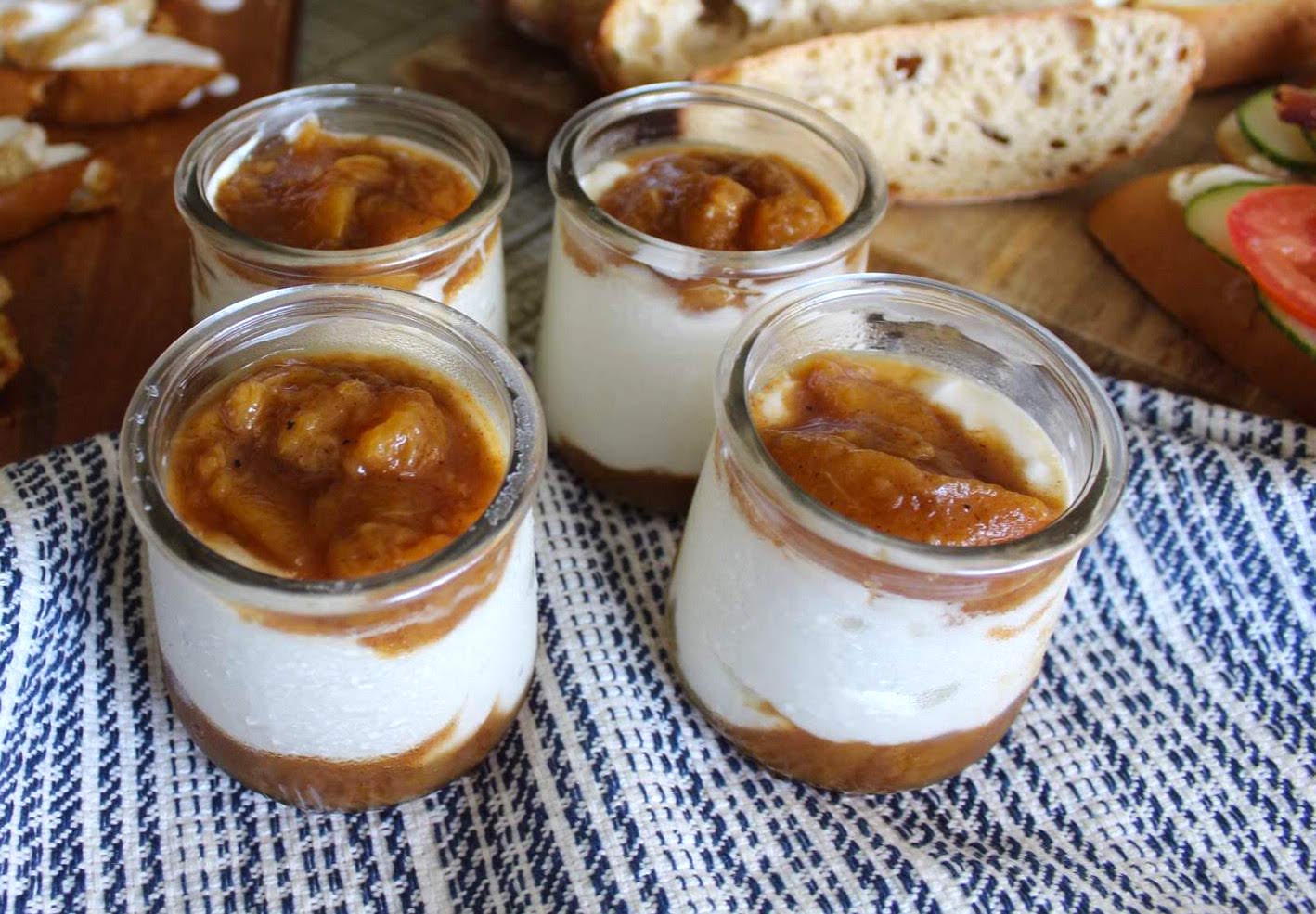 6. Place a layer of peaches on the bottom of a small ramekin, followed by a scoop of yogurt. Top it with the peach compote.